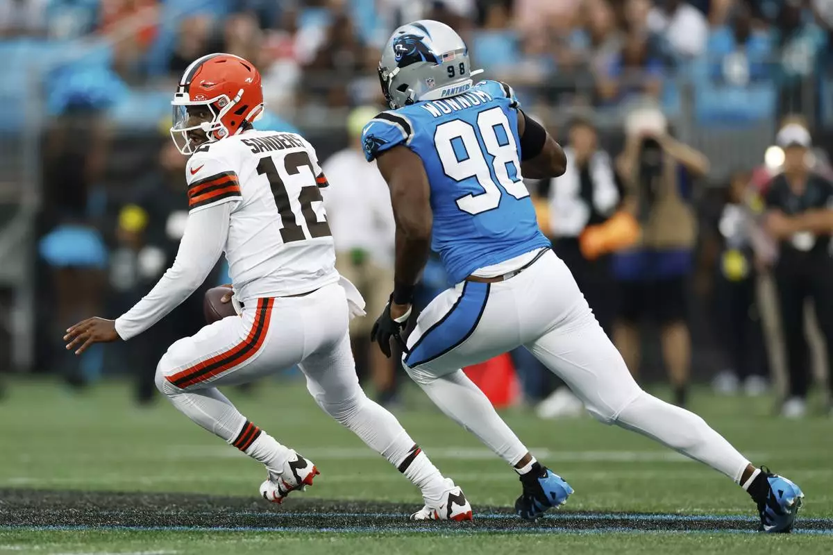 Cleveland Browns quarterback Shedeur Sanders is pursued by Carolina Panthers linebacker D.J. Wonnum during the first half of a preseason NFL football game on Friday, Aug. 8, 2025, in Charlotte, N.C. (AP Photo/Rusty Jones)