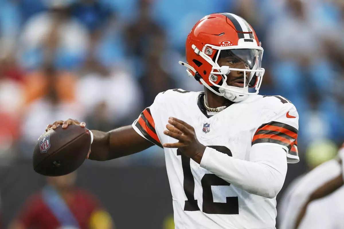 Cleveland Browns quarterback Shedeur Sanders passes against the Carolina Panthers during the first half of a preseason NFL football game on Friday, Aug. 8, 2025, in Charlotte, N.C. (AP Photo/Rusty Jones)