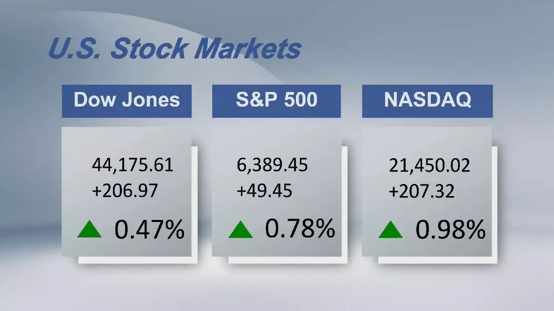 The Dow Jones Industrial Average gained 206.97 points, or 0.47 percent, to finish at 44,175.61. The Standard and Poor's 500 rose 49.45 points, or 0.78 percent, to 6,389.45, while the Nasdaq Composite climbed 207.32 points, or 0.98 percent, to 21,450.02.