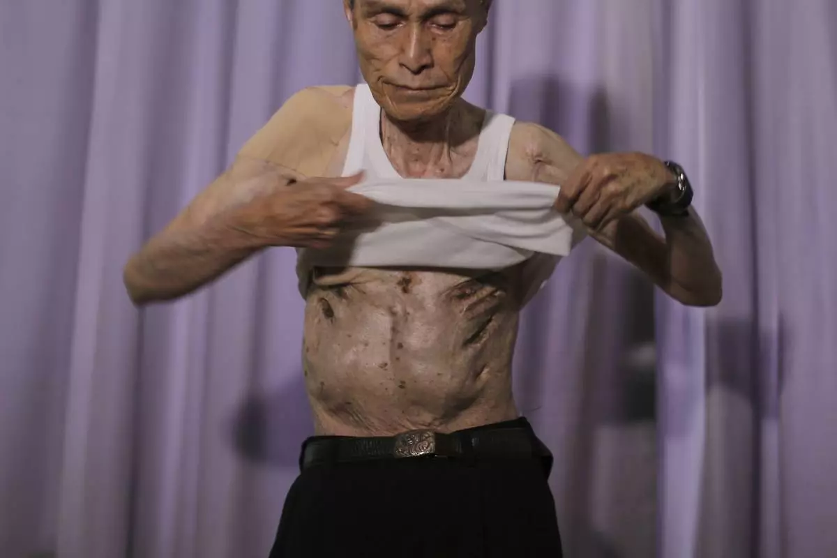 Sumiteru Taniguchi, a survivor of the 1945 atomic bombing of Nagasaki, removes his clothing to show the scars on his body during an interview at his office in Nagasaki, southern Japan, June 30, 2015. (AP Photo/Eugene Hoshiko)