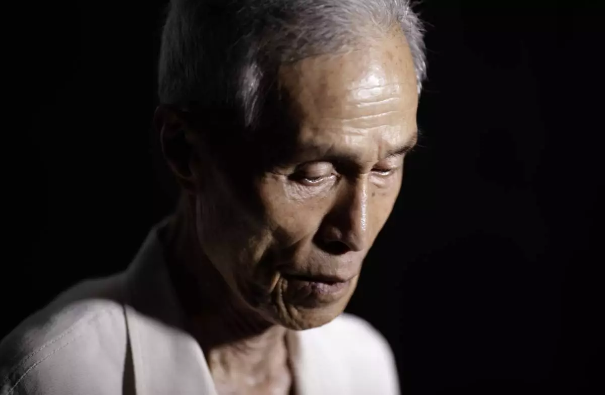 FILE - Sumiteru Taniguchi, 86, a survivor of the 1945 atomic bombing of Nagasaki, poses for a photo during an interview at his office in Nagasaki, southern Japan, June 30, 2015. (AP Photo/Eugene Hoshiko, File)