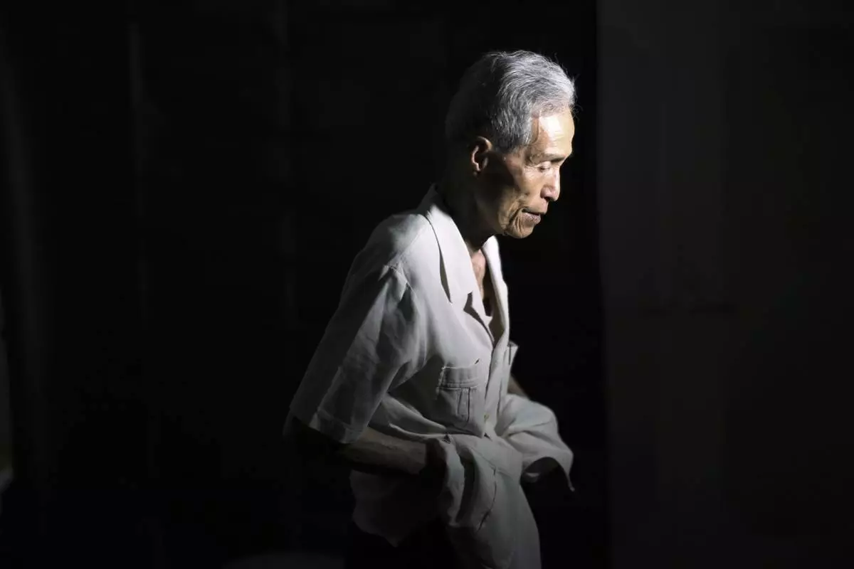 Sumiteru Taniguchi, a survivor of the 1945 atomic bombing of Nagasaki, sits for a photo during an interview at his office in Nagasaki, Nagasaki Prefecture, southern Japan, June 30, 2015. (AP Photo/Eugene Hoshiko)