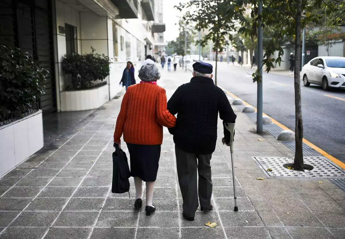 FILE - A couple walk on a sidewalk in Santiago, Chile on May 3, 2017. (AP Photo/Esteban Felix, File)