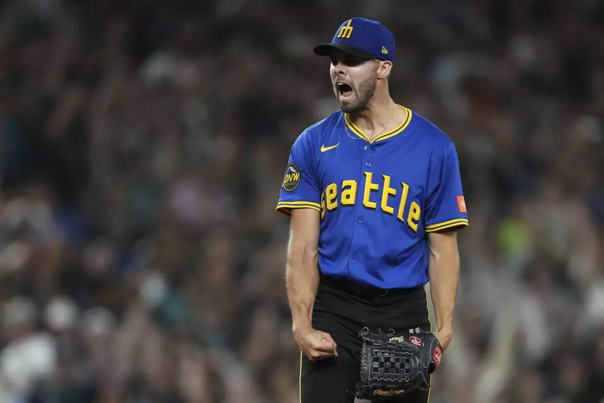 Seattle Mariners relief pitcher Matt Brash reacts to earning the save in a win against the Tampa Bay Rays in a baseball game Friday, Aug. 8, 2025, in Seattle. (AP Photo/Lindsey Wasson)