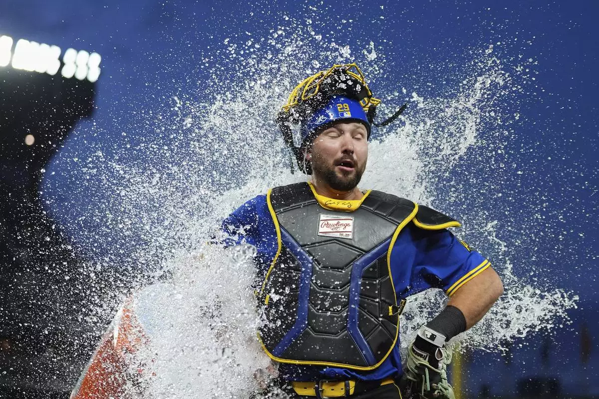Seattle Mariners catcher Cal Raleigh reacts to being doused by teammate Victor Robles to celebrate his three-run home run after a win against the Tampa Bay Rays in a baseball game Friday, Aug. 8, 2025, in Seattle. (AP Photo/Lindsey Wasson)
