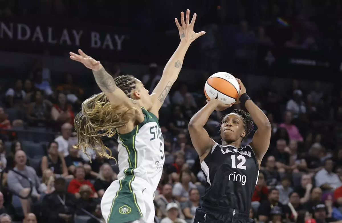 Las Vegas Aces guard Chelsea Gray (12) looks to shoot over Seattle Storm forward Gabby Williams, left, during the first half of a WNBA basketball game Friday, Aug. 8, 2025, in Las Vegas. (Steve Marcus/Las Vegas Sun via AP)