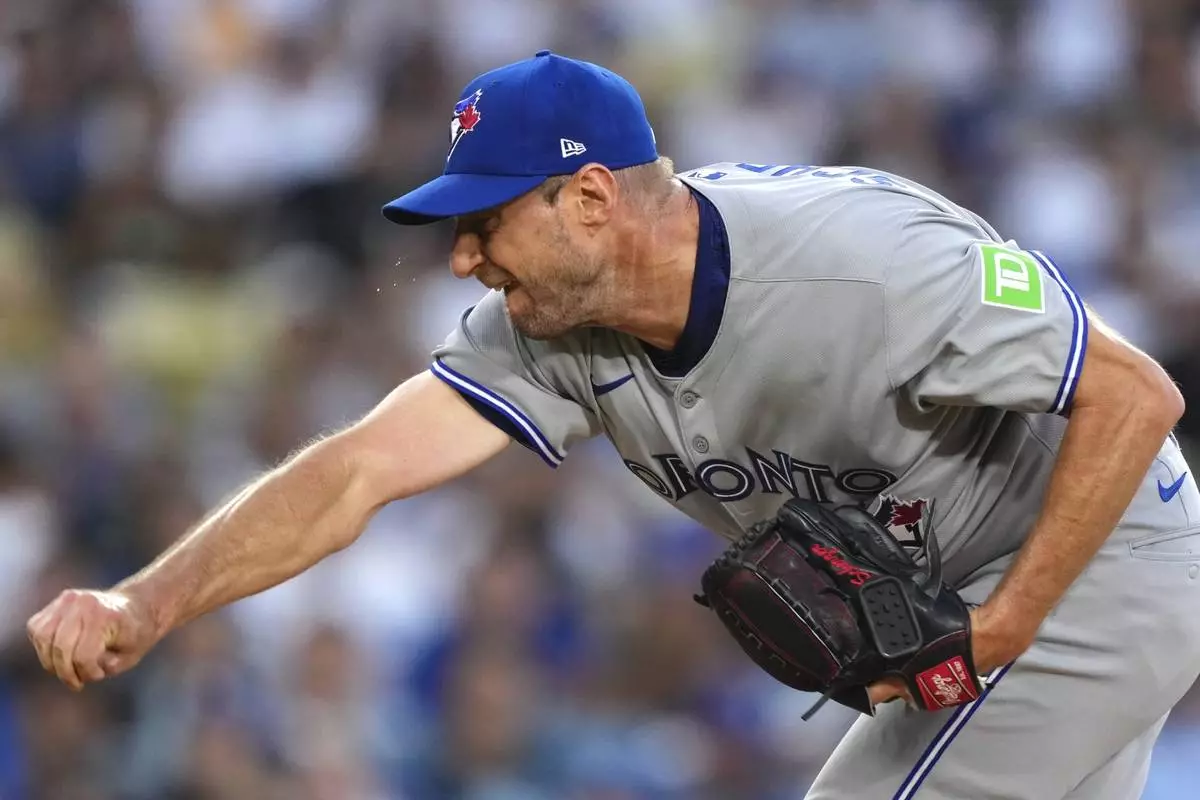 Sweat flies off the face of Toronto Blue Jays starting pitcher Max Scherzer as he throws to the plate during the first inning of a baseball game against the Los Angeles Dodgers, Friday, Aug. 8, 2025, in Los Angeles. (AP Photo/Mark J. Terrill)