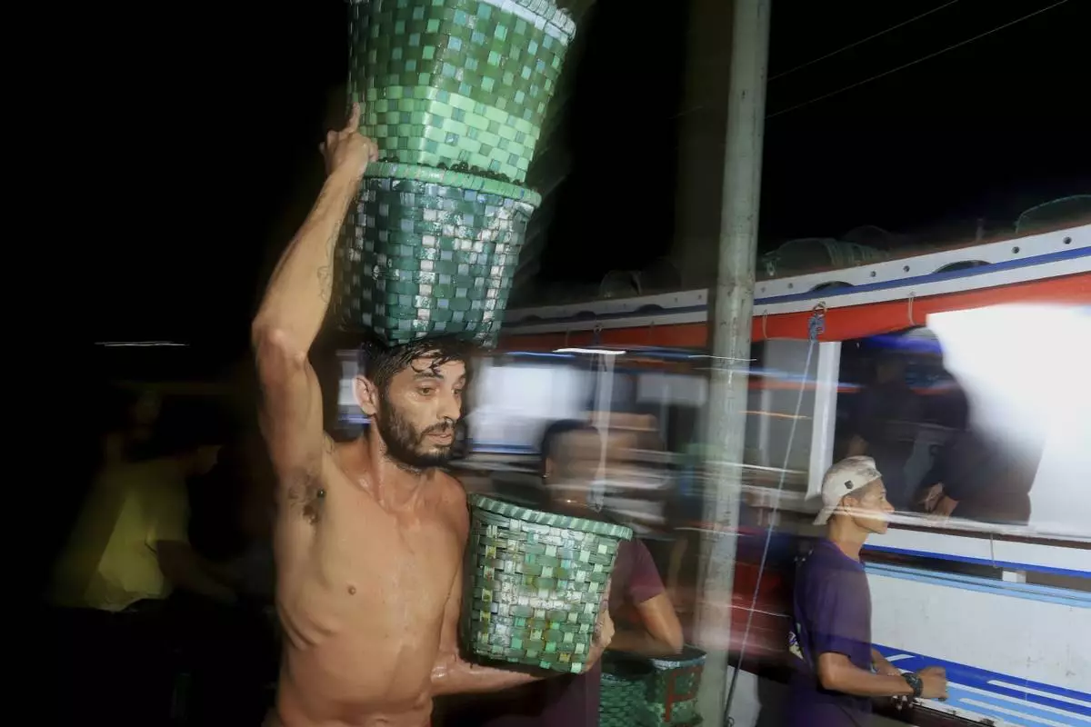 Kenedy Leao carries baskets of acai berries for sale at the Ver-o-Peso riverside market in Belem, Brazil, Tuesday, Aug. 5, 2025. (AP Photo/Paulo Santos)