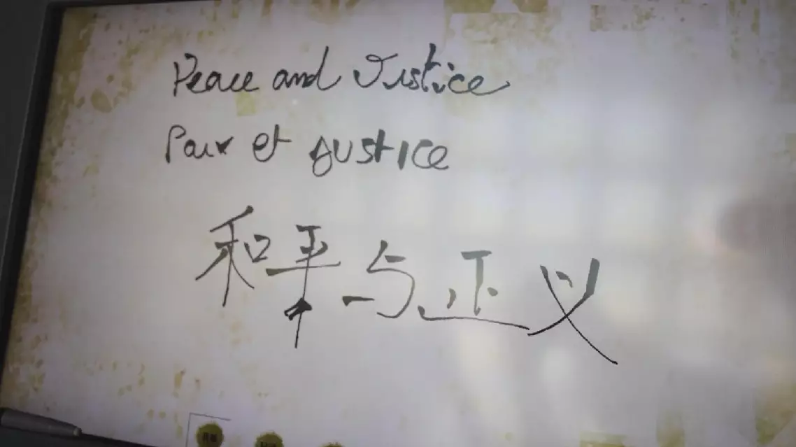 At the end of their visit, Detrez and his companions left a message on the board, writing "Peace and Justice" in Chinese, English, and French.