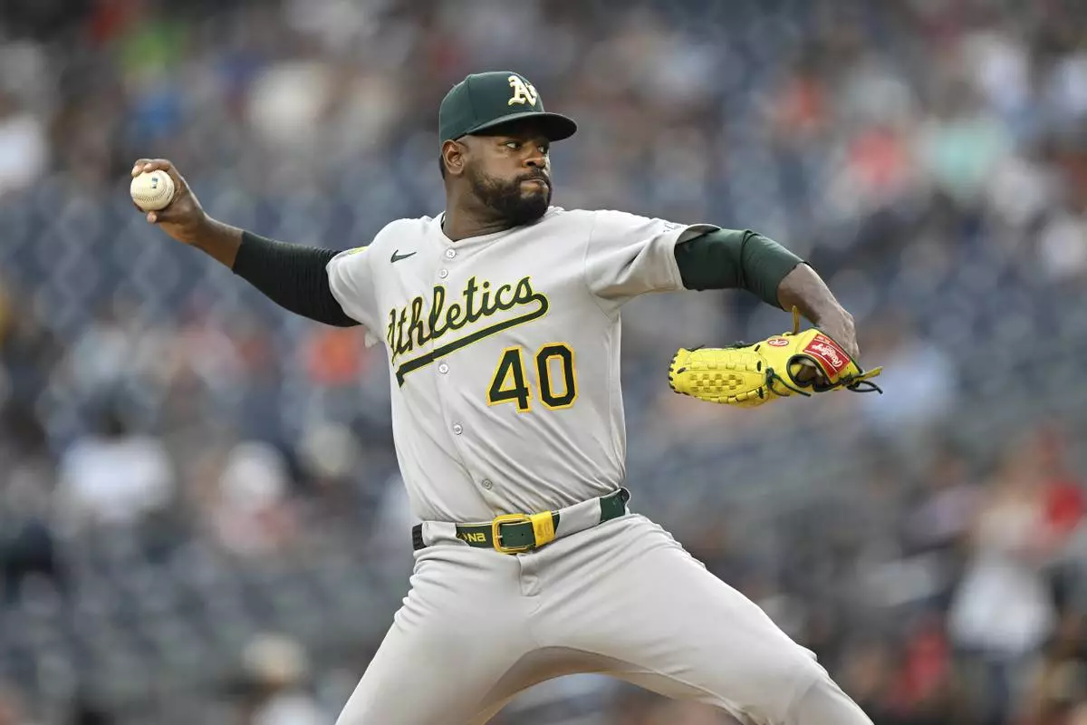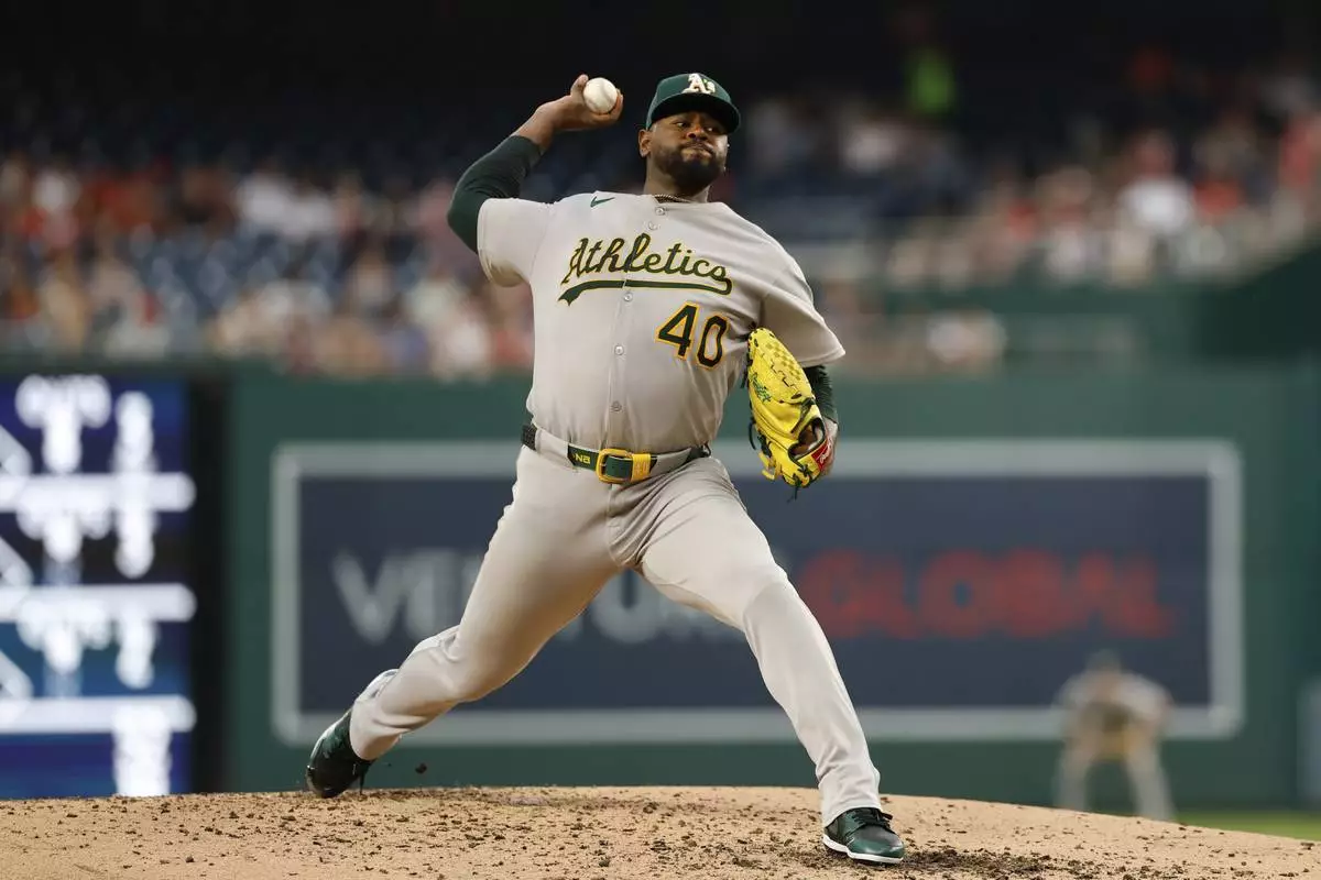 Athletics pitcher Luis Severino (40) throws during the second inning of a baseball game against the Washington Nationals in Washington, Tuesday, Aug. 5, 2025. (AP Photo/Terrance Williams)