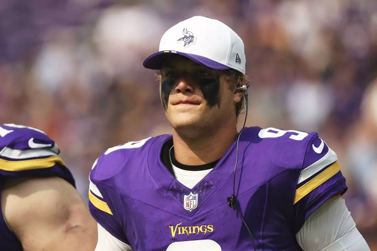 Minnesota Vikings quarterback J.J. McCarthy stands on the sideline during the first half of an NFL preseason football game against the Houston Texans, Saturday, Aug. 9, 2025, in Minneapolis. (AP Photo/Matt Krohn)