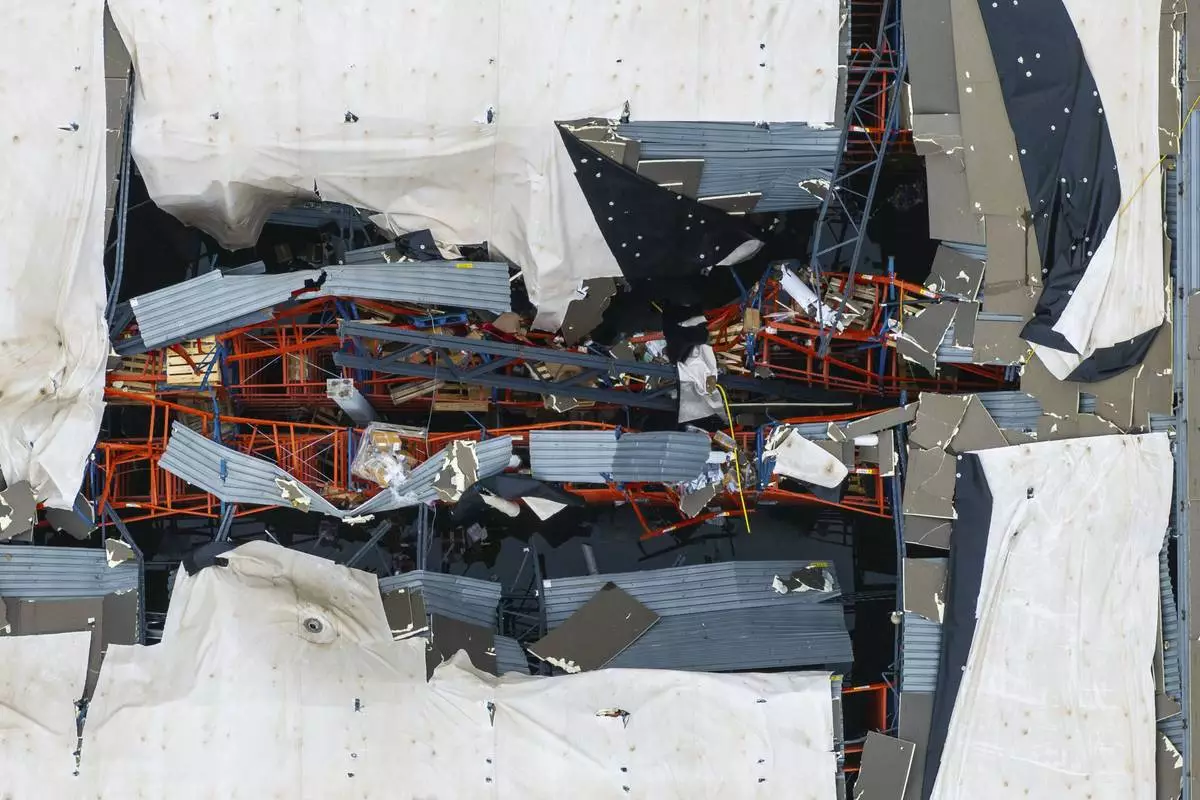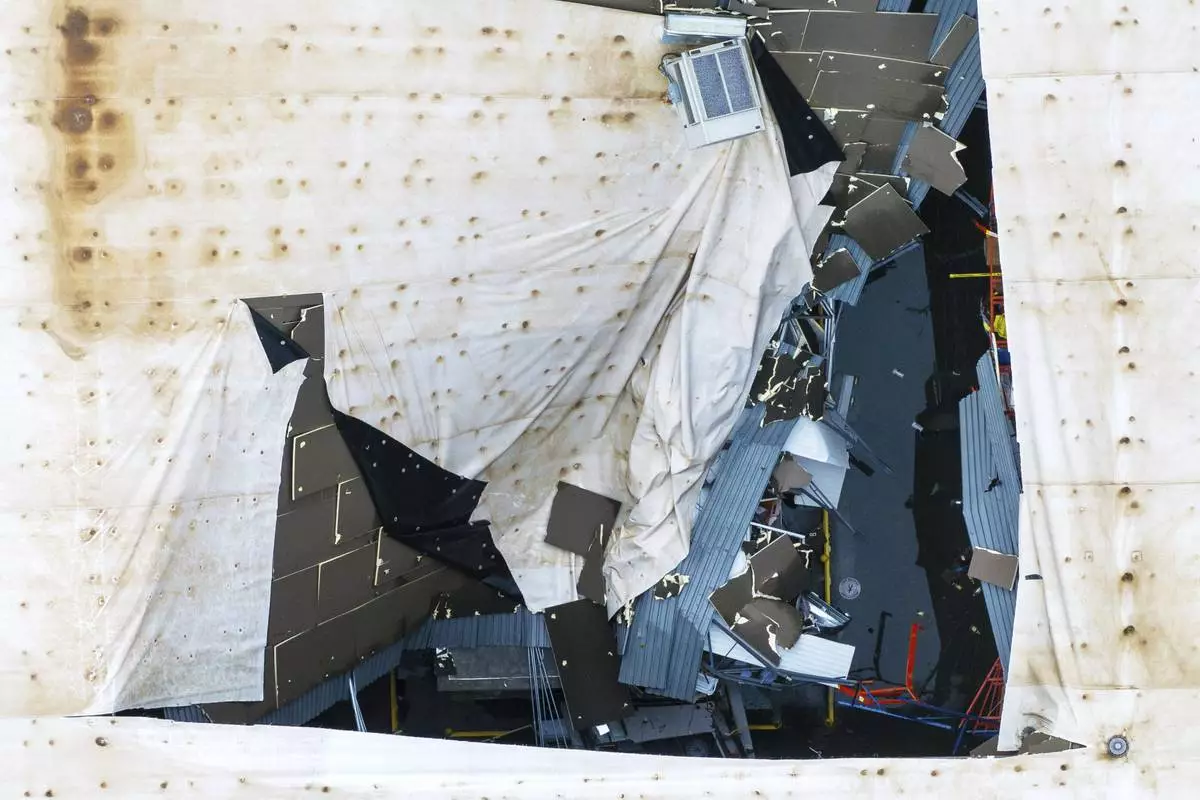 A hole is seen in the roof of the Dollar General distribution warehouse located at 1200 S 10th Streeet in Blair, Neb. on Saturday, Aug. 9, 2025, after an early morning storm caused widespread wind damage in the area. (Chris Machian/Omaha World-Herald via AP)