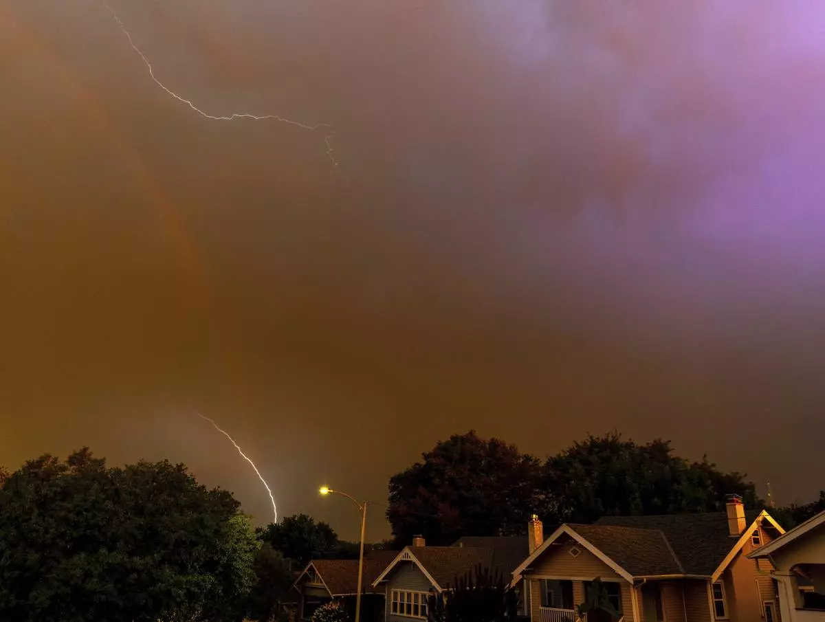 A rainbow is seen as lightning strikes during an early morning storm brought high winds to the area early in Omaha, Neb. on Saturday, Aug. 9, 2025. (Chris Machian/Omaha World-Herald via AP)