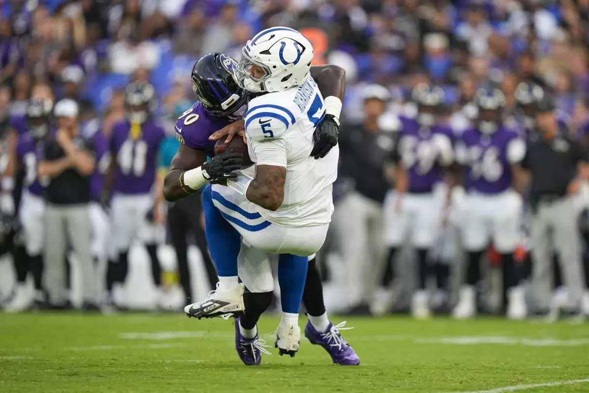 Indianapolis Colts quarterback Anthony Richardson Sr. (5) is sacked by Baltimore Ravens linebacker David Ojabo (90) during the firs half of an NFL preseason football game Thursday, Aug. 7, 2025, in Baltimore. (AP Photo/Alex Brandon)