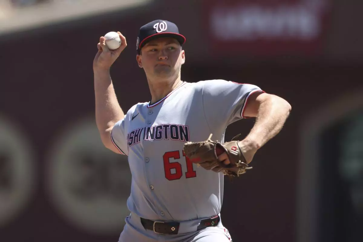 Washington Nationals starting pitcher Brad Lord throws to an San Francisco Giants batter during the first inning of a baseball game Saturday, Aug. 9, 2025, in West Sacramento, Calif. (AP Photo/Scott Marshall)