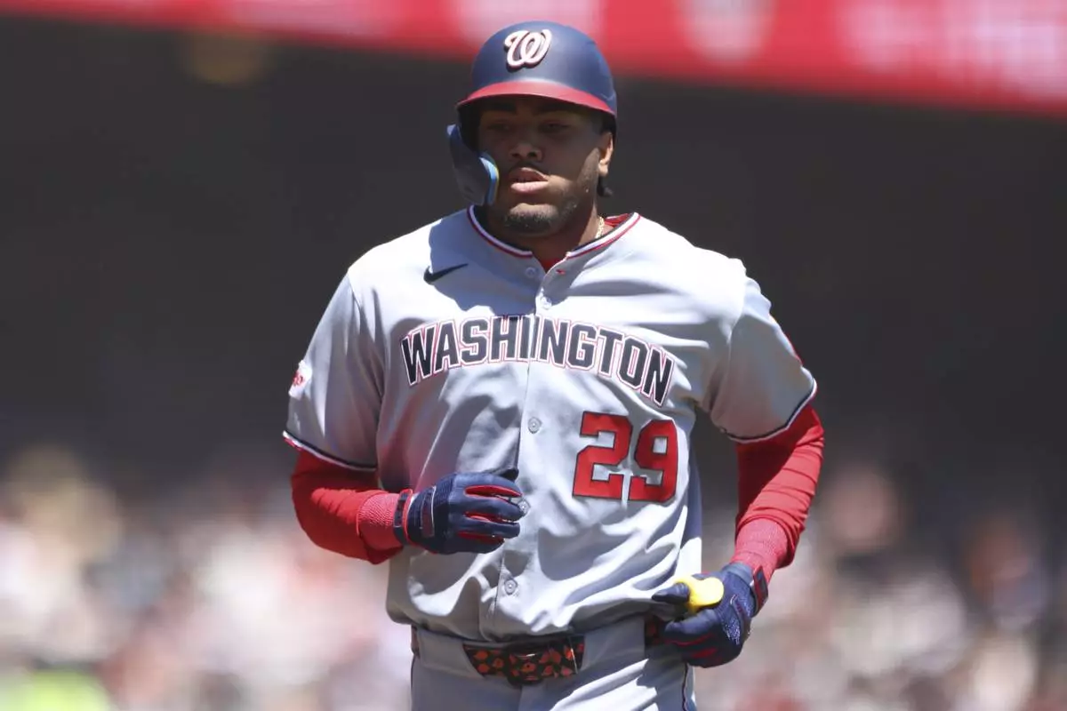 Washington Nationals' James Wood jogs around the bases after hitting a solo home run during the first inning of a baseball game against the San Francisco Giants, Saturday, Aug. 9, 2025, in West Sacramento, Calif. (AP Photo/Scott Marshall)