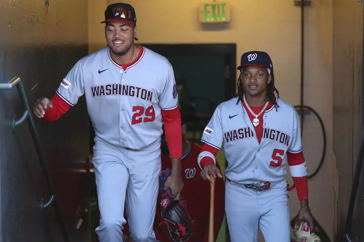 Washington Nationals' James Wood (29) and CJ Abrams (5) walk up the tunnel before a baseball game against the San Francisco Giants, Saturday, Aug. 9, 2025, in West Sacramento, Calif. (AP Photo/Scott Marshall)