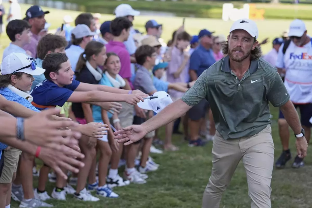 Tommy Fleetwood, of England, reaches to touch fans as he walks off the 18th green during the third round of the St. Jude Championship golf tournament Saturday, Aug. 9, 2025, in Memphis, Tenn. (AP Photo/George Walker IV)