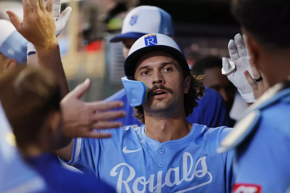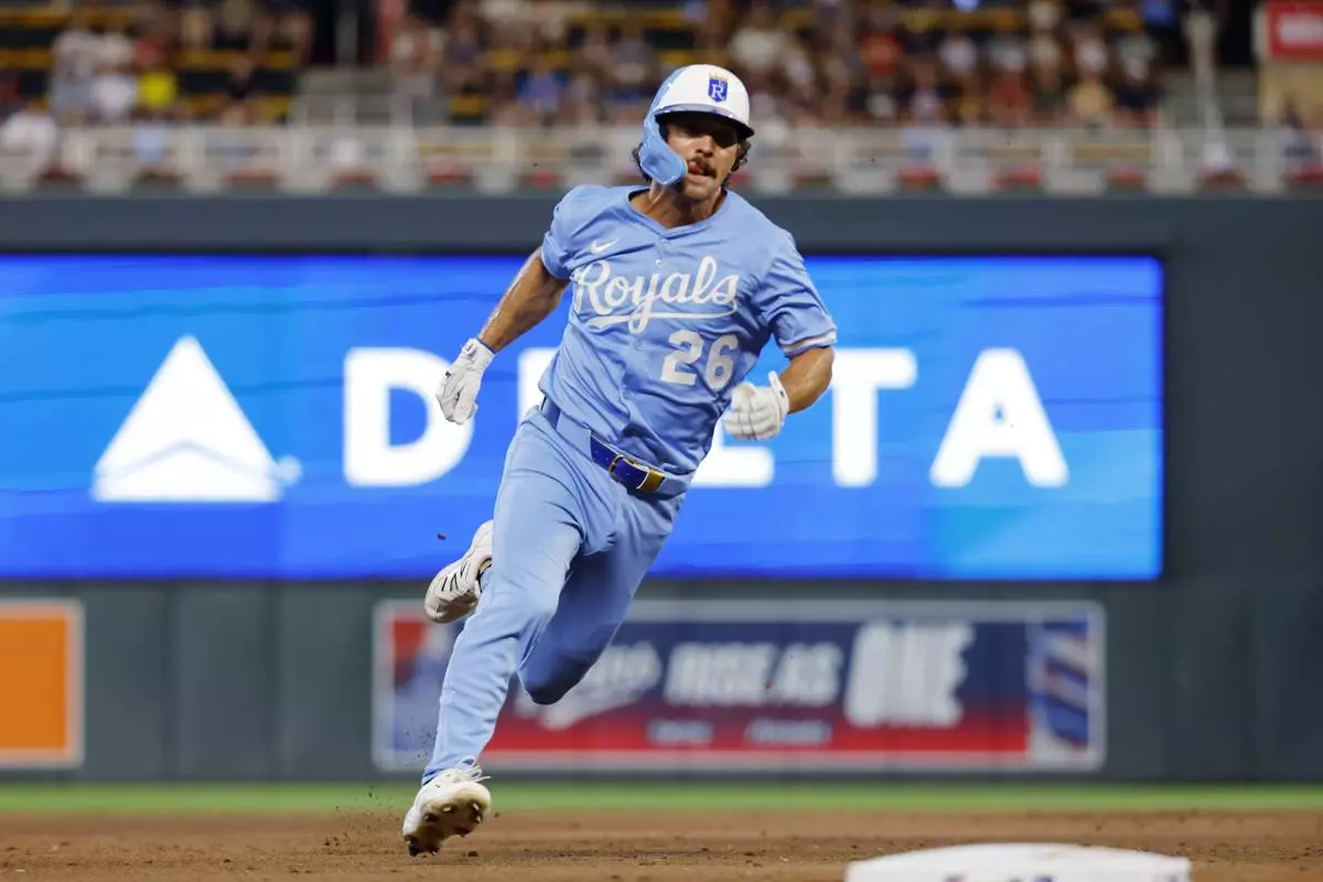 Kansas City Royals' Adam Frazier rounds third base en route to scoring against the Minnesota Twins on a Jonathan India single in the ninth inning of a baseball game Saturday, Aug. 9, 2025, in Minneapolis. (AP Photo/Bruce Kluckhohn)