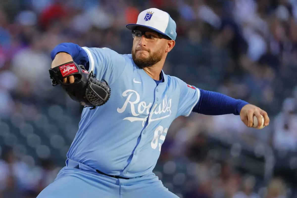 Kansas City Royals starting pitcher Noah Cameron throws to the Minnesota Twins in the third inning of a baseball game Saturday, Aug. 9, 2025, in Minneapolis. (AP Photo/Bruce Kluckhohn)