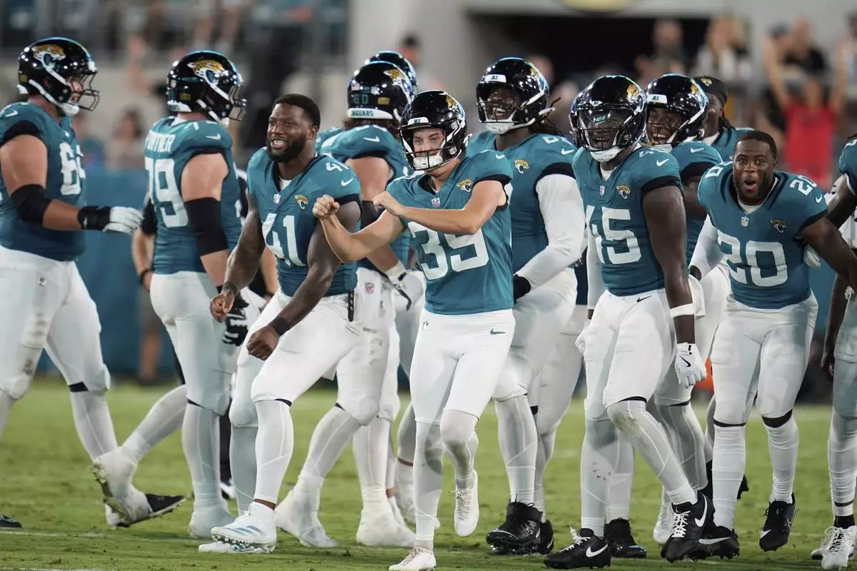 Jacksonville Jaguars place kicker Cam Little (39) celebrates a field goal during the first half of an NFL preseason football game against the Pittsburgh Steelers, Saturday, Aug. 9, 2025, in Jacksonville, Fla. (AP Photo/John Raoux)