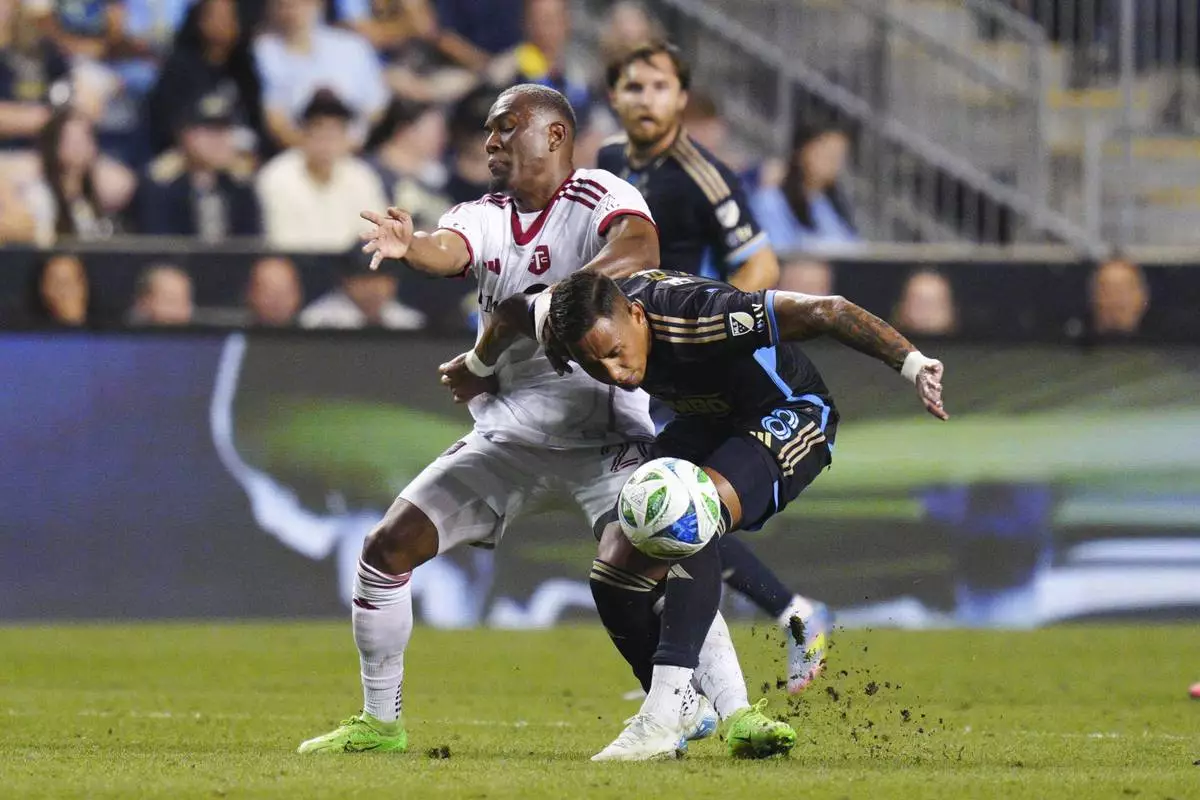 Toronto FC's Deybi Flores, left, and Philadelphia Union's Jesús Bueno, front right, battle for the ball during the second half of an MLS soccer match, Saturday, Aug. 9, 2025, in Chester, Pa. (AP Photo/Derik Hamilton)