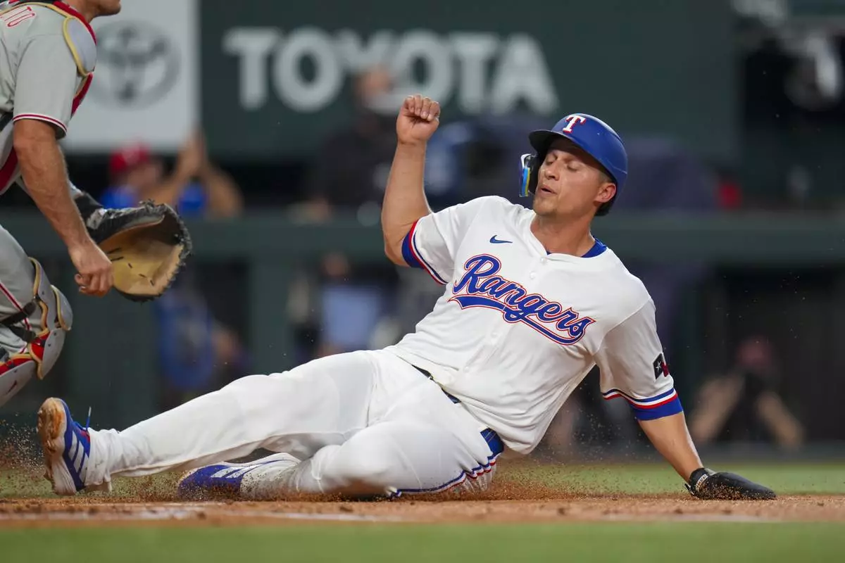 Texas Rangers' Corey Seager slides into home while scoring on a single by teammate Marcus Semien during the first inning of a baseball game against the Philadelphia Phillies Saturday, Aug. 9, 2025, in Arlington, Texas. (AP Photo/Julio Cortez)