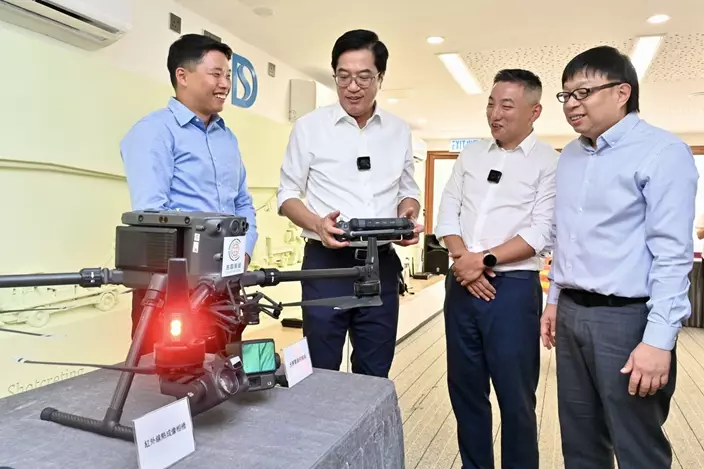 Technological breakthroughs: Deputy Financial Secretary Michael Wong (second left) learns about various technological breakthroughs in the drones used by the Development Bureau. Source from news.gov.hk