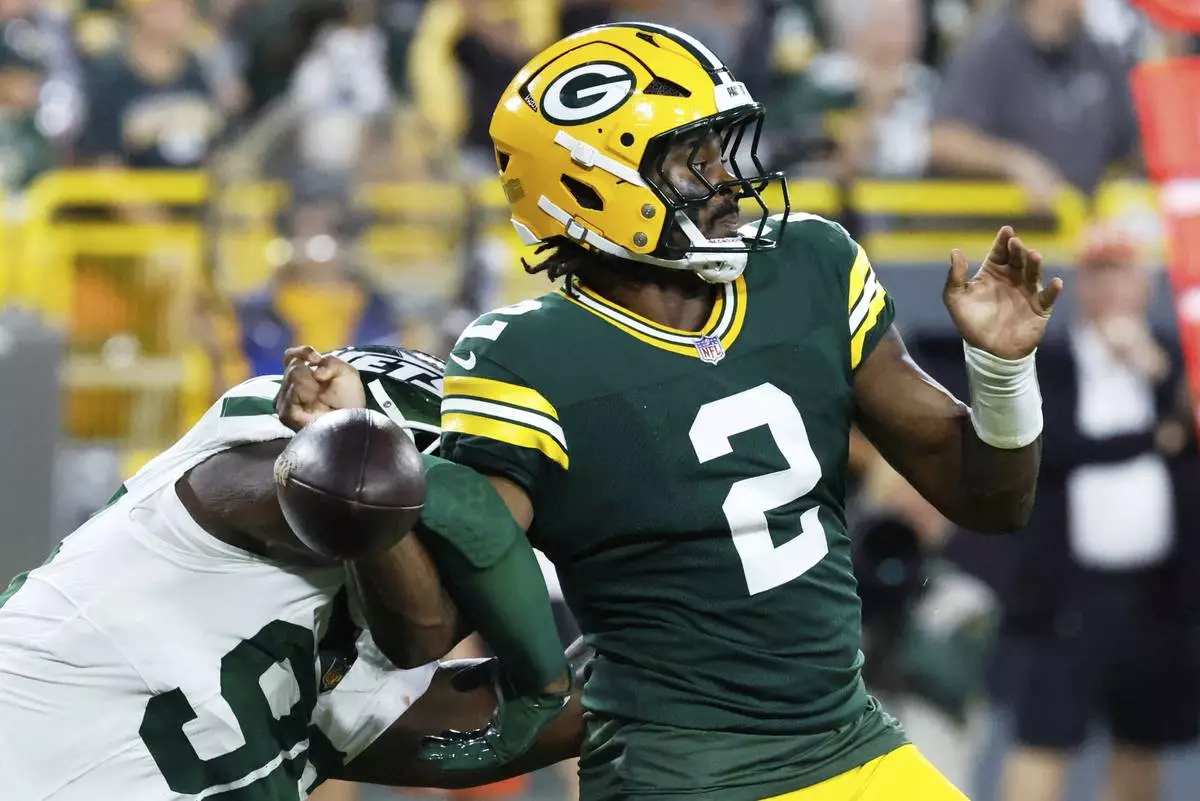 New York Jets' Leonard Taylor III forces Green Bay Packers' Malik Willis to fumble in the endzone during the first half of a preseason NFL football game Saturday, Aug. 9, 2025, in Green Bay, Wis. (AP Photo/Mike Roemer)