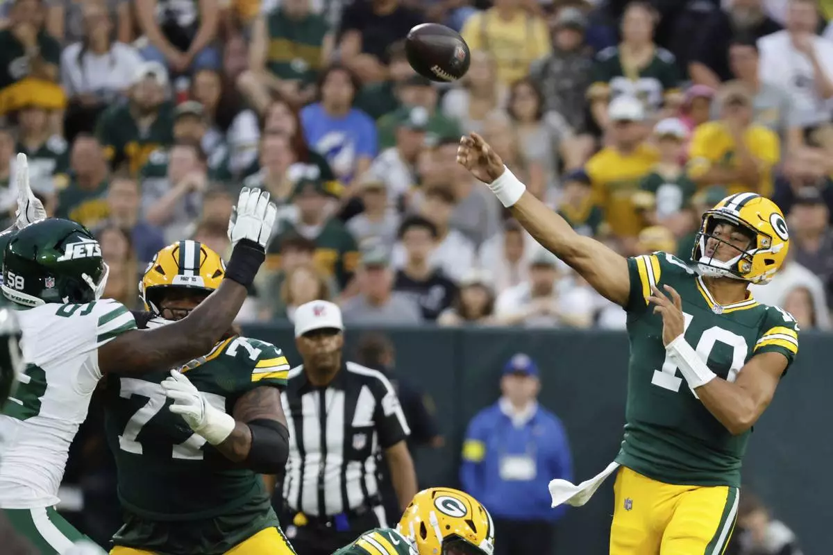 Green Bay Packers' Jordan Love thorws during the first half of a preseason NFL football game against the New York Jets Saturday, Aug. 9, 2025, in Green Bay, Wis. (AP Photo/Mike Roemer)
