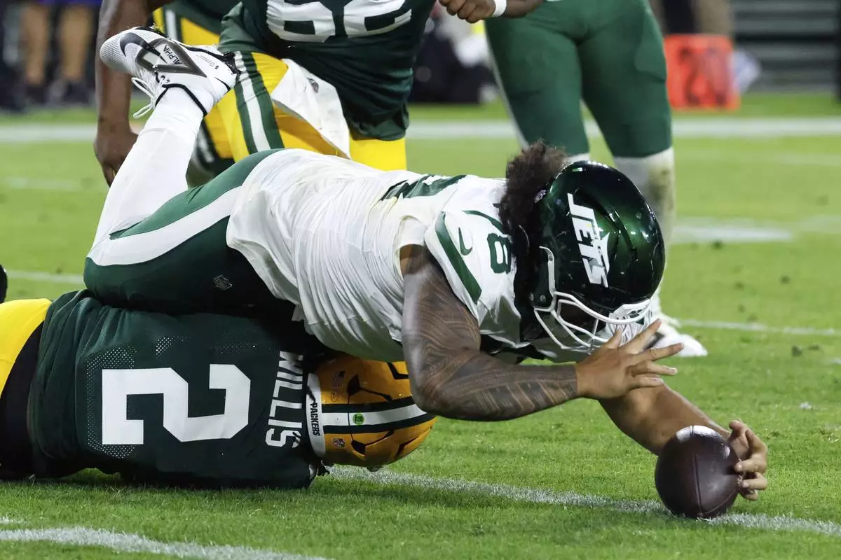 New York Jets' Jay Tufele recovers a fumble after Green Bay Packers' Malik Willis was stip sacked during the first half of a preseason NFL football game Saturday, Aug. 9, 2025, in Green Bay, Wis. (AP Photo/Mike Roemer)