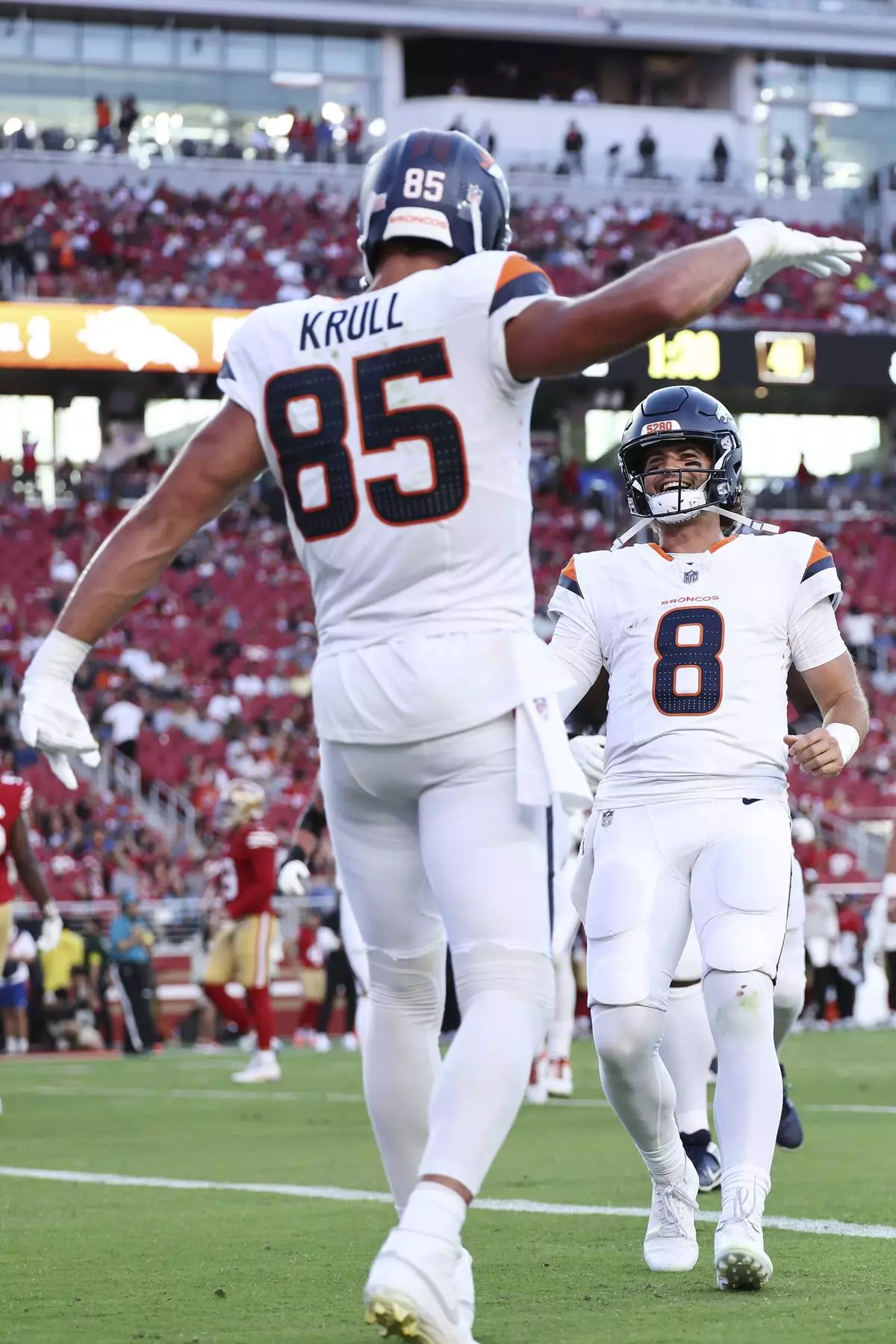 Denver Broncos tight end Lucas Krull (85) celebrates his touchdown catch with quarterback Jarrett Stidham (8) during the first half of a preseason NFL football game Saturday, Aug. 9, 2025, in Santa Clara, Calif. (AP Photo/Kelley L Cox)