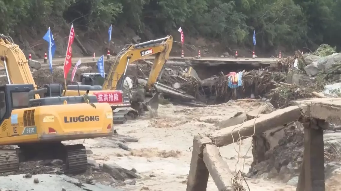 To accelerate progress, workers have been repairing the road from both ends simultaneously. The three sections damaged on Saturday were down to one -- a collapsed bridge spanning 1.5 kilometers -- by Sunday noon. Crews are installing underground pipes and backfilling with sand and gravel to erect a new bridge beside the old one. Part of the river has been diverted to protect the site from further erosion and ensure work safety and progress.
