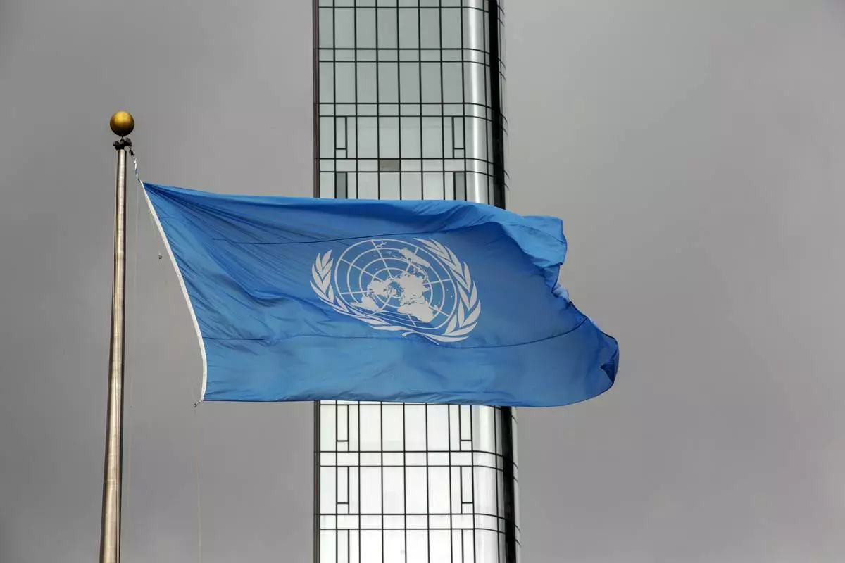 FILE - The UN flag flies on a stormy day at the United Nations during the United Nations General Assembly on Sept. 22, 2022. (AP Photo/Ted Shaffrey, File)