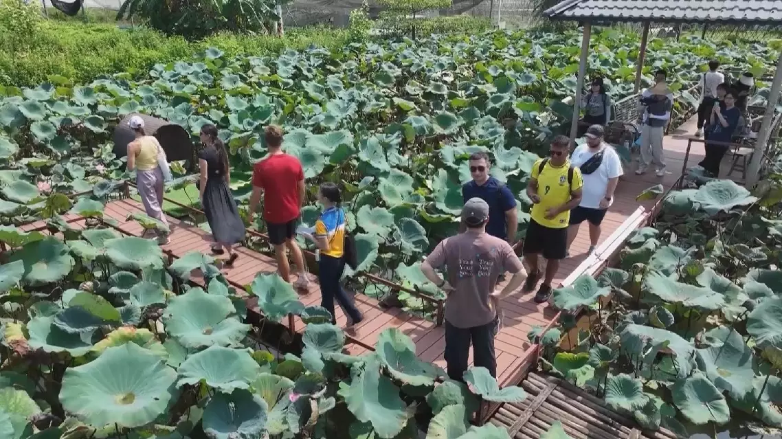 In an ancient village in the Sanshui District of Foshan City, in south China's Guangdong Province, international tourists are captivated by the stunning beauty of lush, green lotus leaves as they wander along ponds, stopping frequently to take photos.