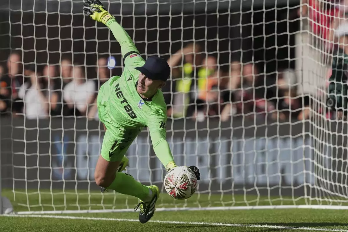 Crystal Palace's goalkeeper Dean Henderson saves during penalty shootout during the FA Community Shield final soccer match between Liverpool and Crystal Palace at Wembley Stadium in London,Sunday, Aug. 10, 2025. (AP Photo/Dave Shopland)