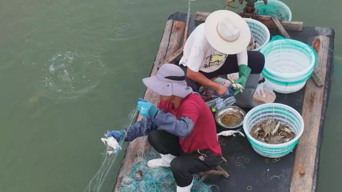 "(For each trip, we work for about) four hours, hauling in around 200 to 250 kilograms. We catch the males first. Females can only be harvested after the Mid-Autumn Festival, once their crab cream is fully developed," said Liu Jun, a local farmer.