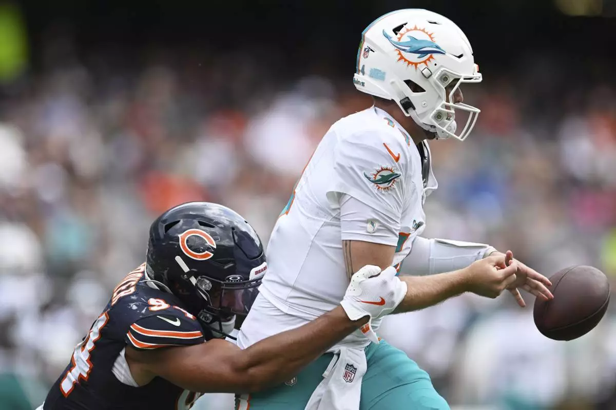 Chicago Bears defensive end Austin Booker, left, sacks Miami Dolphins quarterback Quinn Ewers, right, causing a fumble during the second half of an NFL preseason football game, Sunday, Aug. 10, 2025, in Chicago. (AP Photo/Paul Beaty)