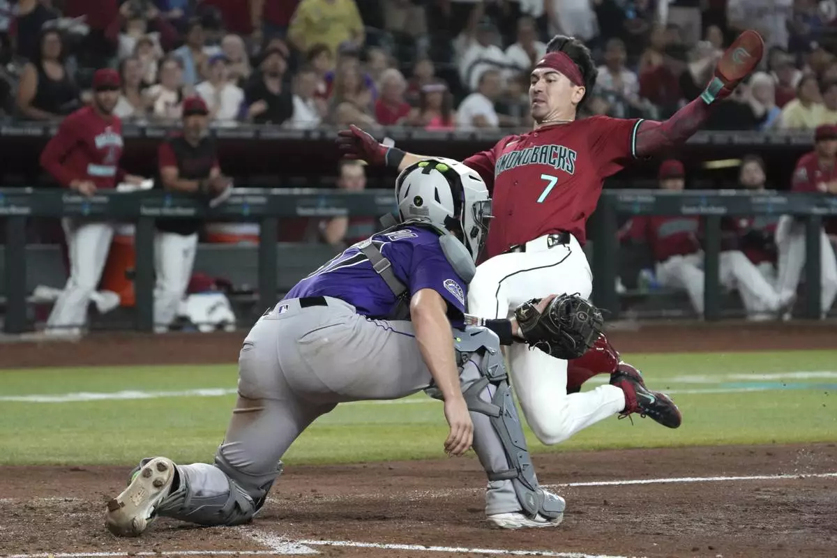 Arizona Diamondbacks' Corbin Carroll, right, leaps to score against Colorado Rockies catcher Braxton Fulford, left, after a single hit by Ketel Marte in the fifth inning of a baseball game, Sunday, Aug 10, 2025, in Phoenix. (AP Photo/Rick Scuteri)