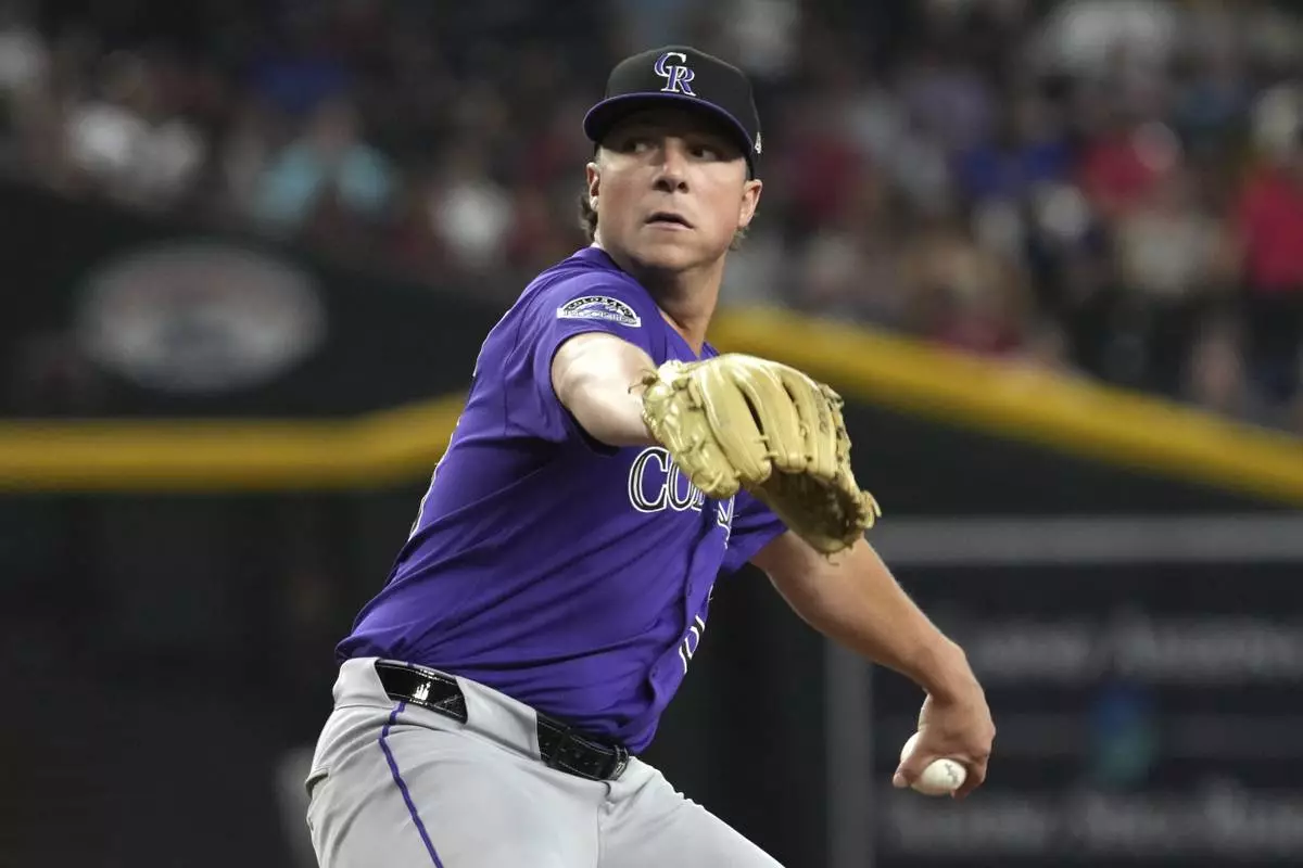 Colorado Rockies pitcher Ryan Rolison throws against the Arizona Diamondbacks in the fifth inning of a baseball game, Sunday, Aug 10, 2025, in Phoenix. (AP Photo/Rick Scuteri)