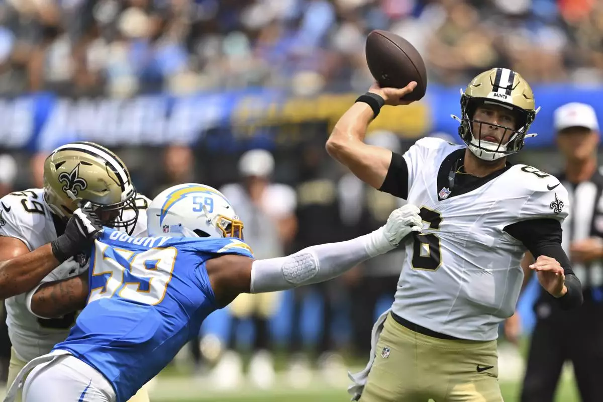 New Orleans Saints quarterback Tyler Shough (6) throws under pressure from Los Angeles Chargers linebacker Kylan Guidry (59) during the first half of a preseason NFL football game Sunday, Aug. 10, 2025, in Inglewood, Calif. (AP Photo/Jayne Kamin- Oncea)
