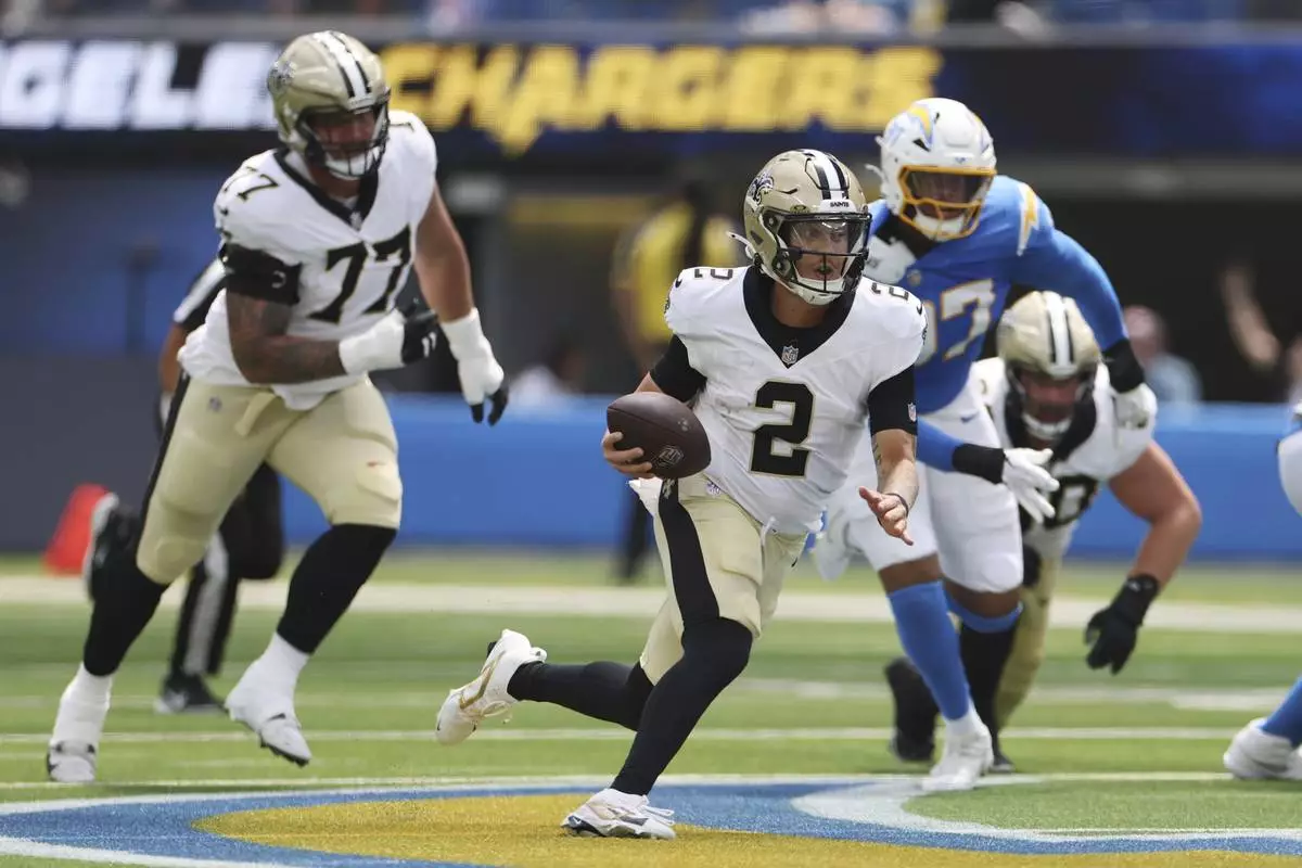 New Orleans Saints quarterback Spencer Rattler (2) runs against the Los Angeles Chargers during the first half of a preseason NFL football game Sunday, Aug. 10, 2025, in Inglewood, Calif. (AP Photo/Eric Thayer)