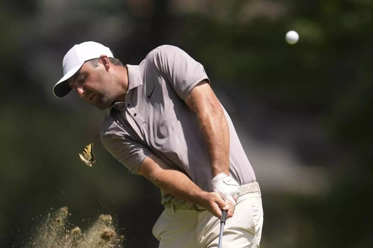 Scottie Scheffler hits on the first fairway as a butterfly flies by during the final round of the St. Jude Championship golf tournament Sunday, Aug. 10, 2025, in Memphis, Tenn. (AP Photo/George Walker IV)