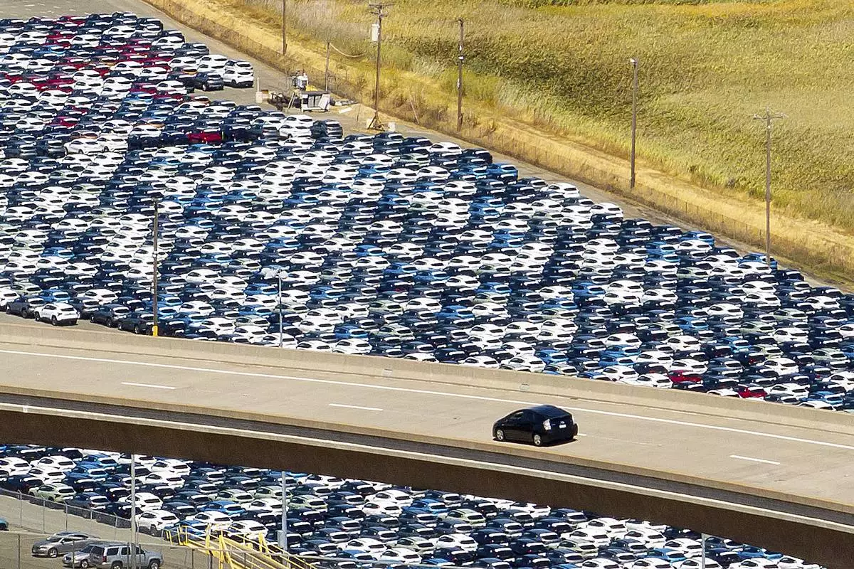 New cars line a lot at the Port of Benicia in Benicia, Calif., on Friday, Aug. 8, 2025. (AP Photo/Noah Berger)