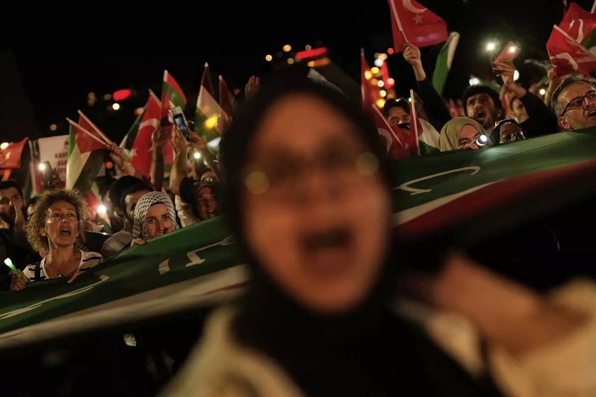 Protesters chant slogans during a pro-Palestinian demonstration outside the Byzantine-era Hagia Sophia Mosque in Istanbul, Saturday, Aug. 9, 2025. (AP Photo/Khalil Hamra)