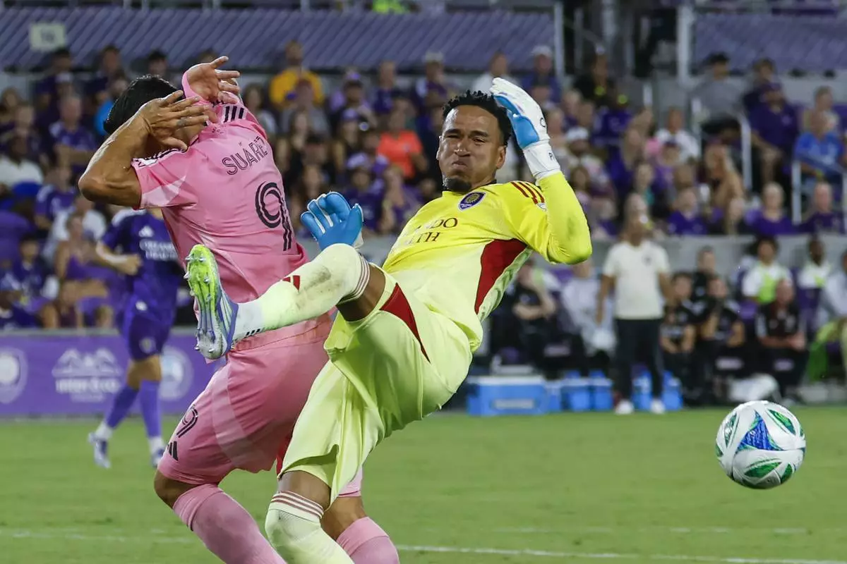 Orlando City goalkeeper Pedro Gallese, right, and Inter Miami forward Luis Suárez, left, go for the ball during the first half of an MLS soccer match, Sunday, Aug. 10, 2025, in Orlando, Fla. (AP Photo/Kevin Kolczynski)