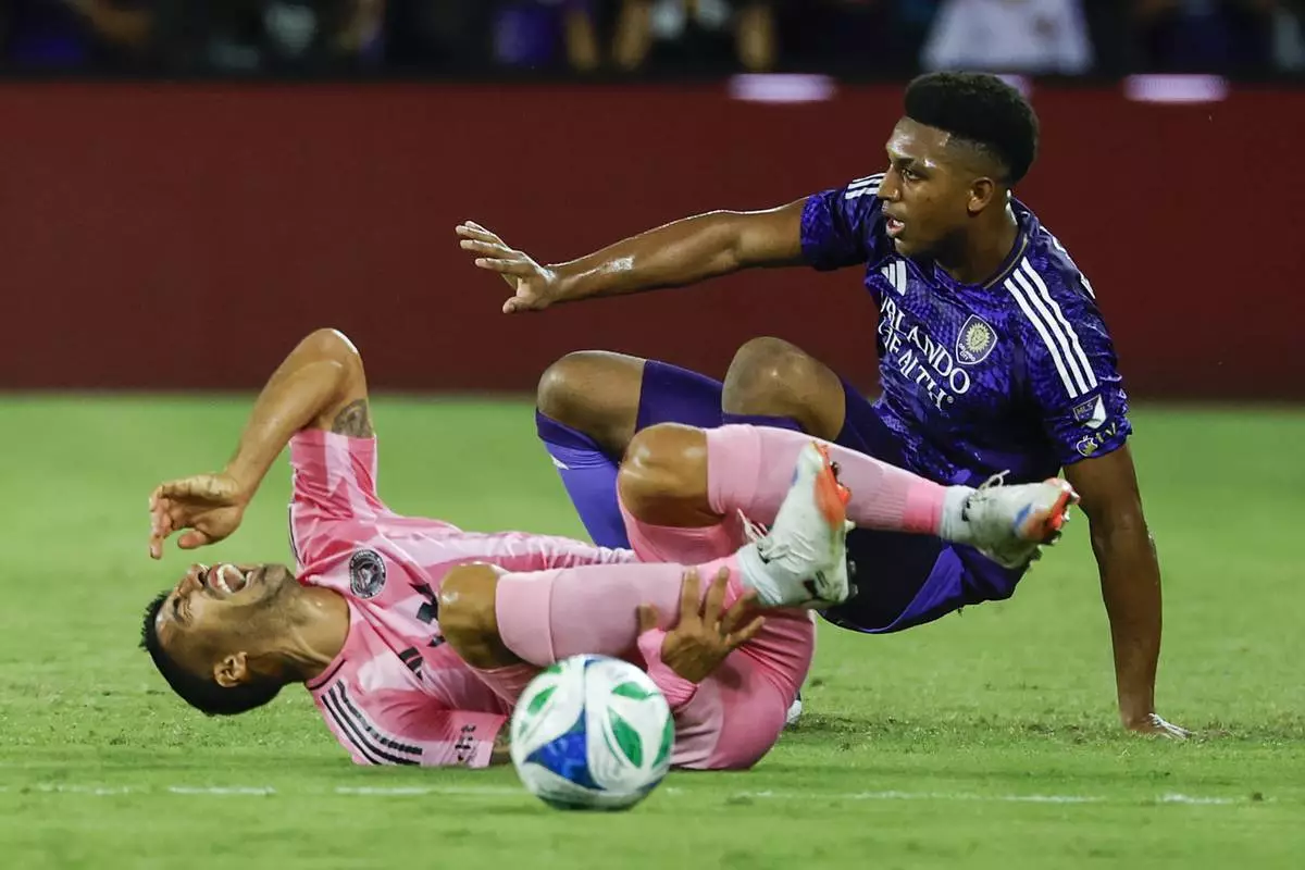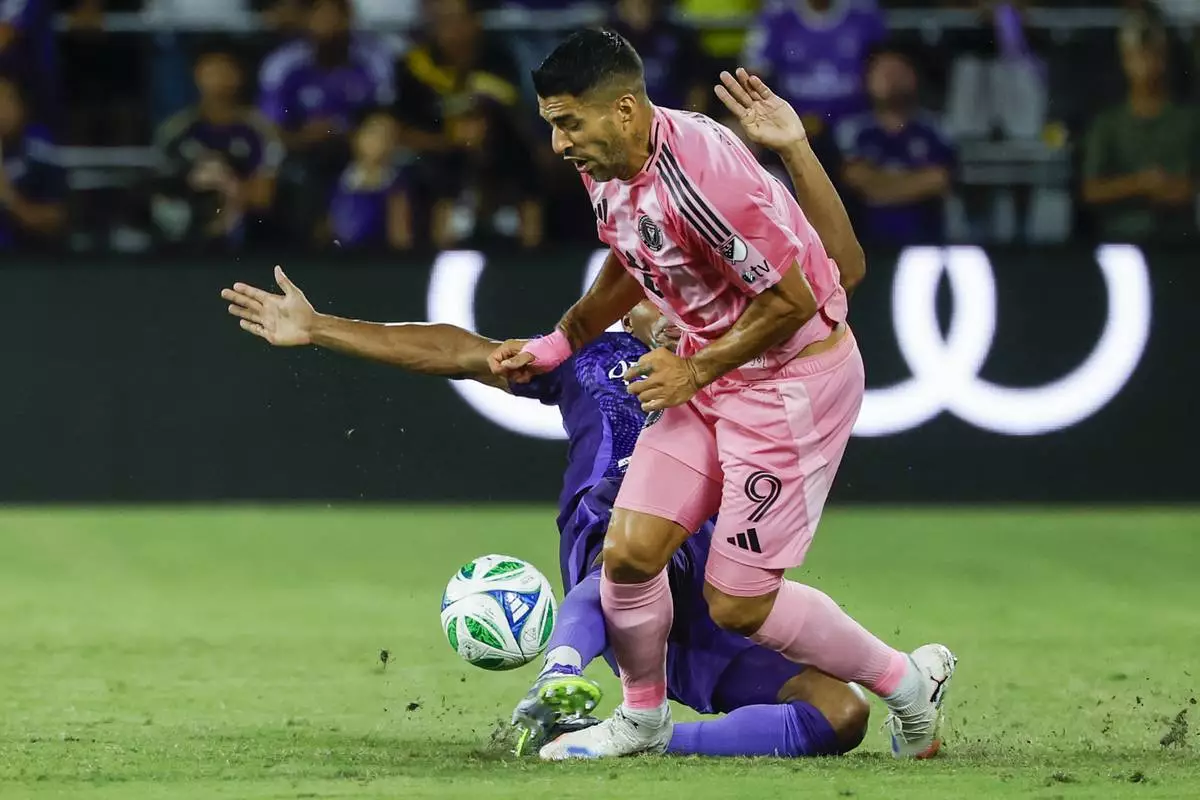 Orlando City defender Alex Freeman, right, slides into Inter Miami forward Luis Suárez (9) during the first half of an MLS soccer match Sunday, Aug. 10, 2025, in Orlando, Fla. (AP Photo/Kevin Kolczynski)