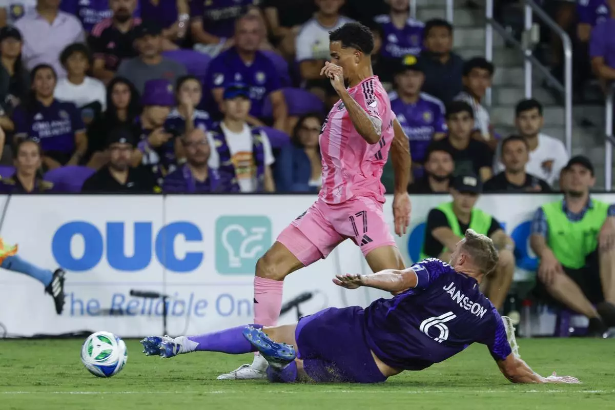 Orlando City defender Robin Jansson (6) kicks the ball away from Inter Miami defender Ian Fray (17) during the first half of an MLS soccer match, Sunday, Aug. 10, 2025, in Orlando, Fla. (AP Photo/Kevin Kolczynski)