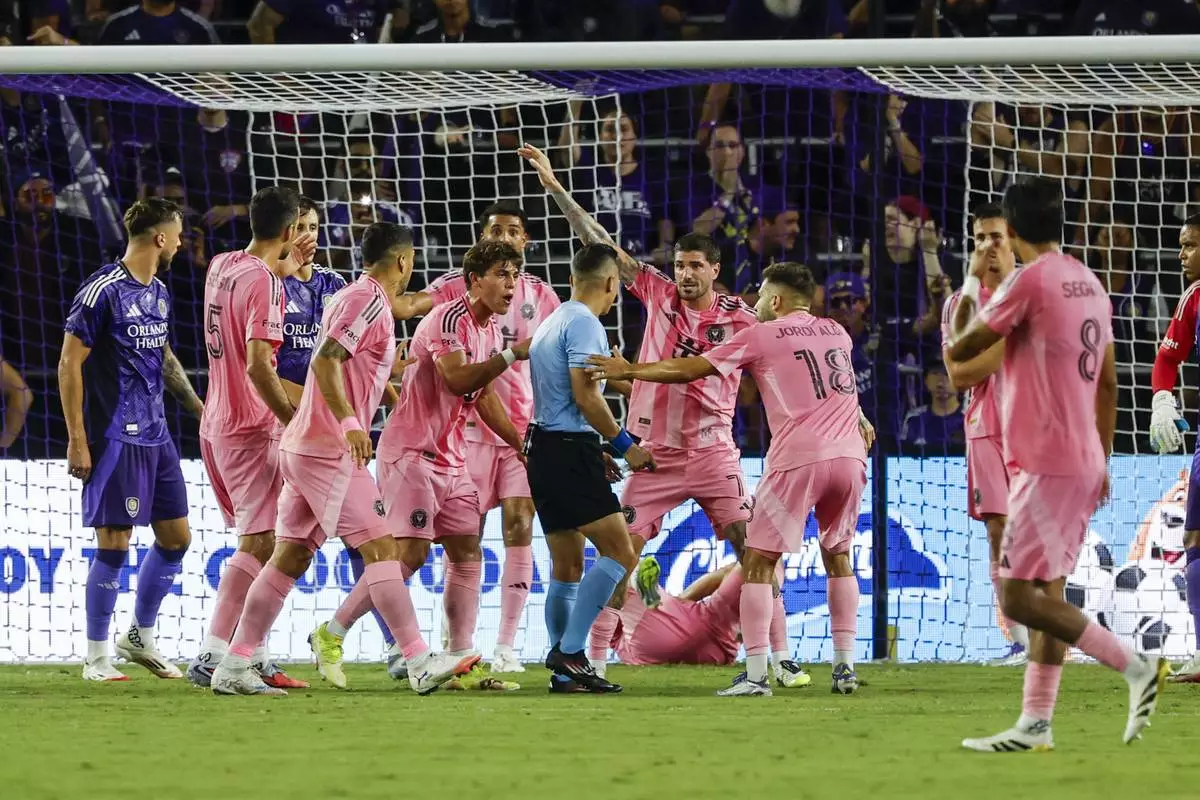 Inter Miami players an surround official, center, while arguing about a corner kick against Orlando City during the first half of an MLS soccer match, Sunday, Aug. 10, 2025, in Orlando, Fla. (AP Photo/Kevin Kolczynski)