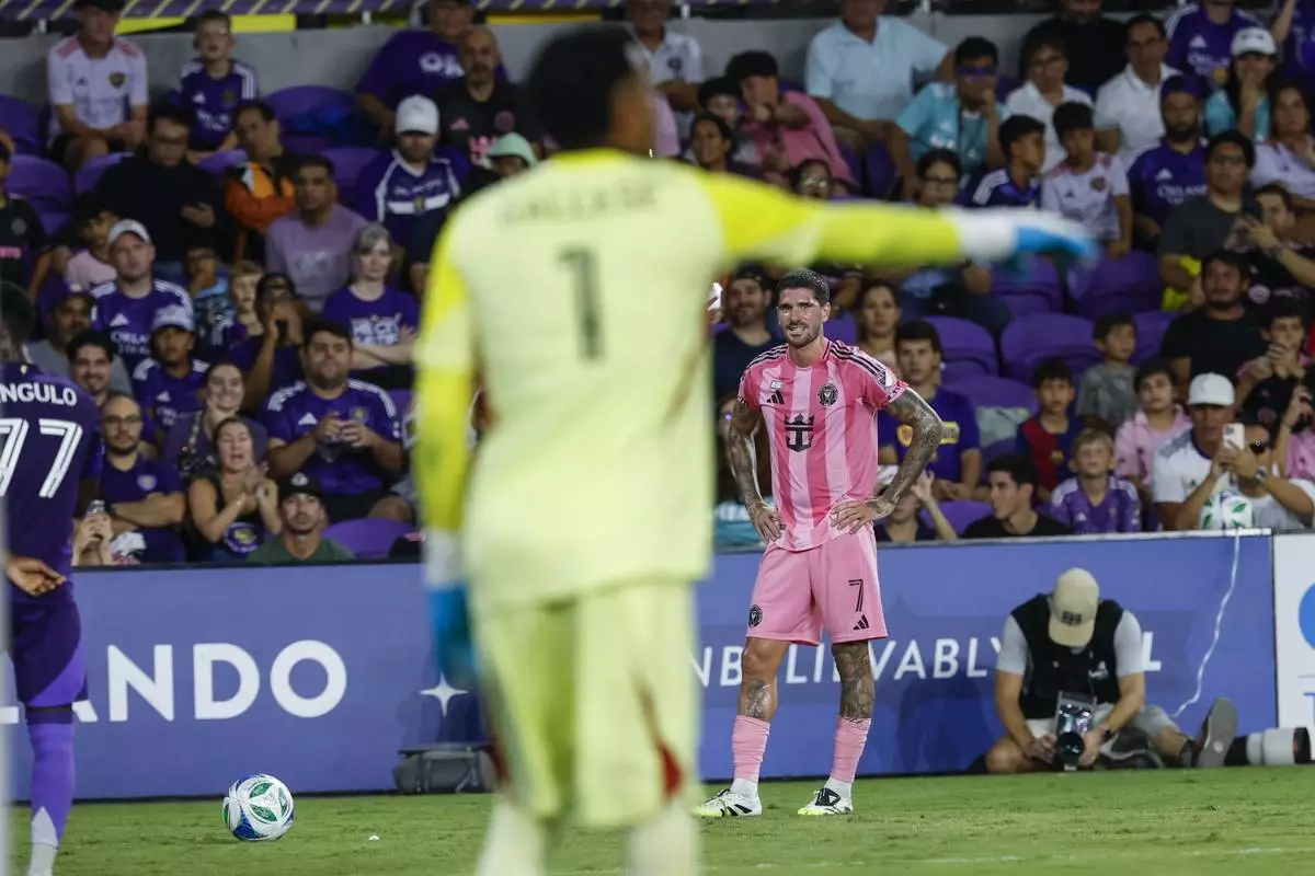 Inter Miami midfielder Fafà Picault (7) gets ready for penalty kick against Orlando City goalkeeper Pedro Gallese (1) during the first half of an MLS soccer match, Sunday, Aug. 10, 2025, in Orlando, Fla. (AP Photo/Kevin Kolczynski)